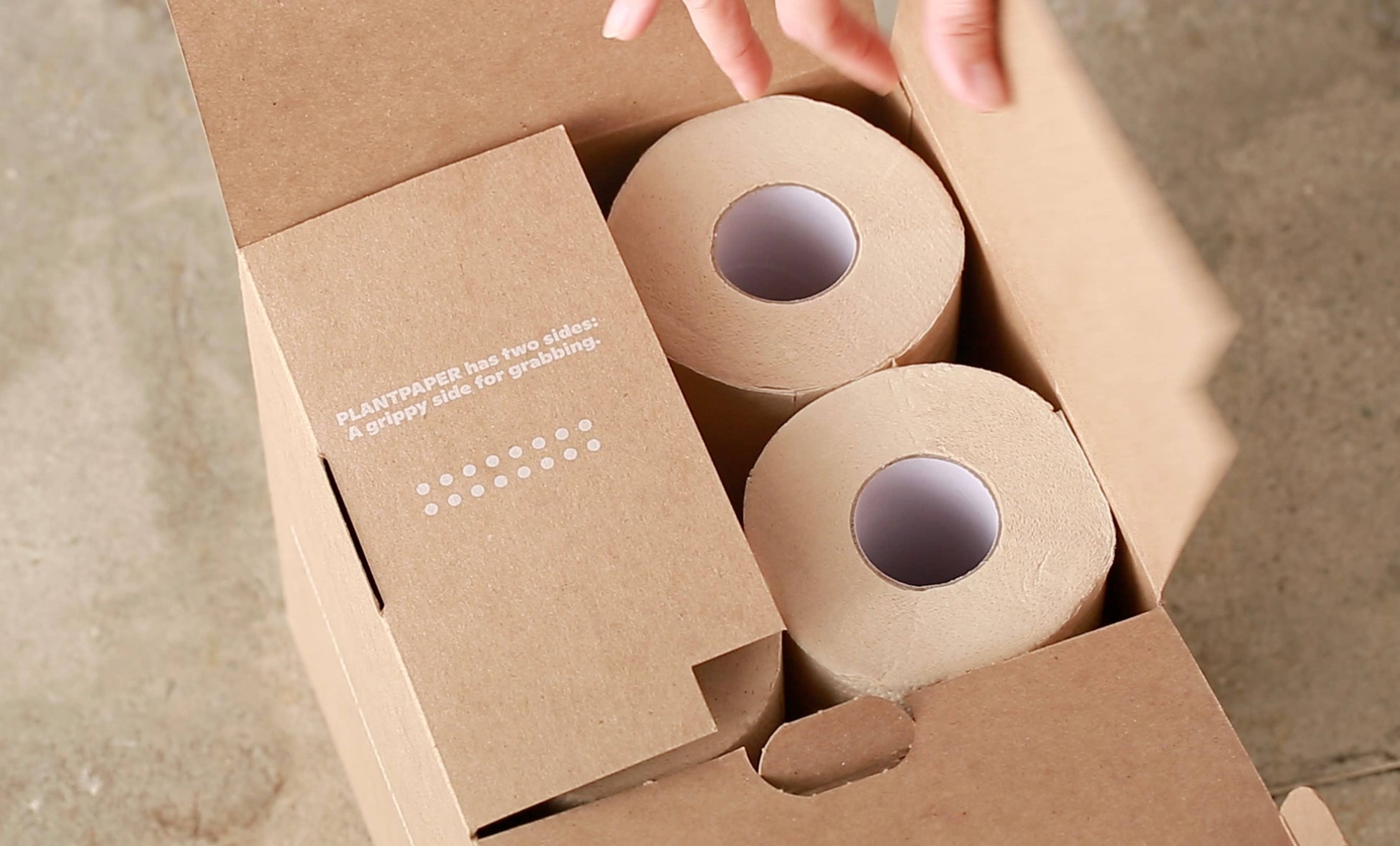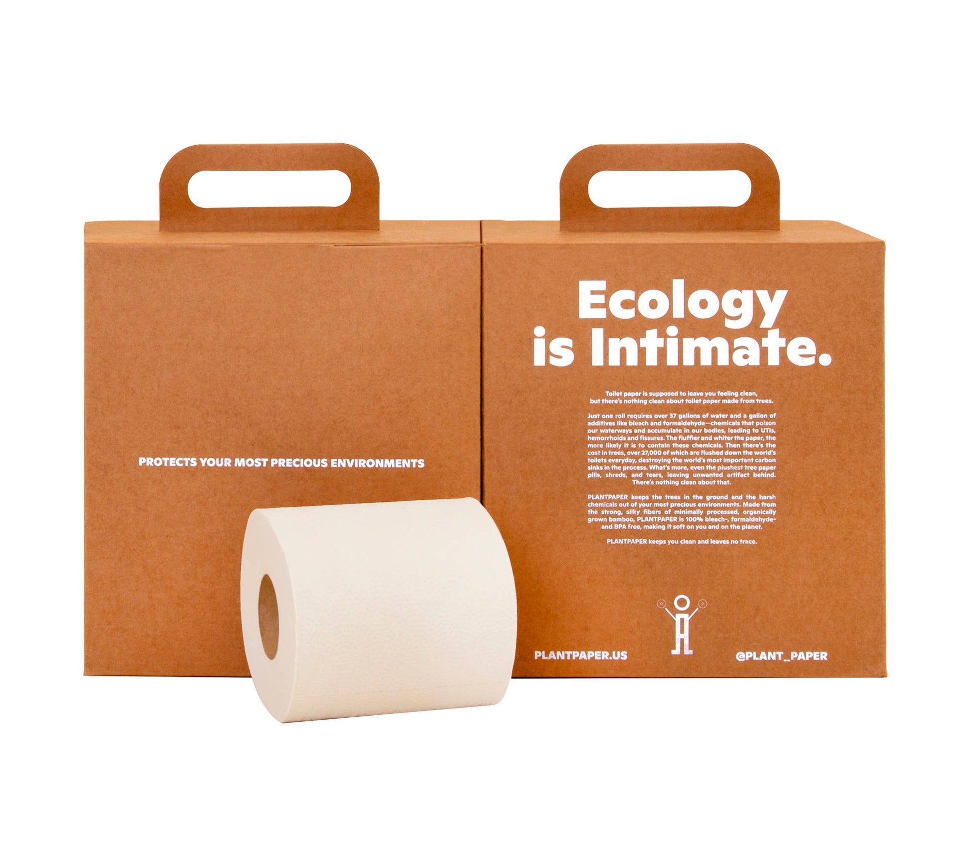 The chipboard 8-pack is a beautiful and discreet low-impact box that holds 8 naked rolls inside. Its construction is somewhat origami-like, making the overall experience special for the customer and helps to re-frame what toilet paper should be (and what PlantPaper is!): at once environmentally-sound, premium, soft and strong. These packs sit and stack efficiently on shelves and have a handle making it easy for customers to bring home without needing any extra bags.