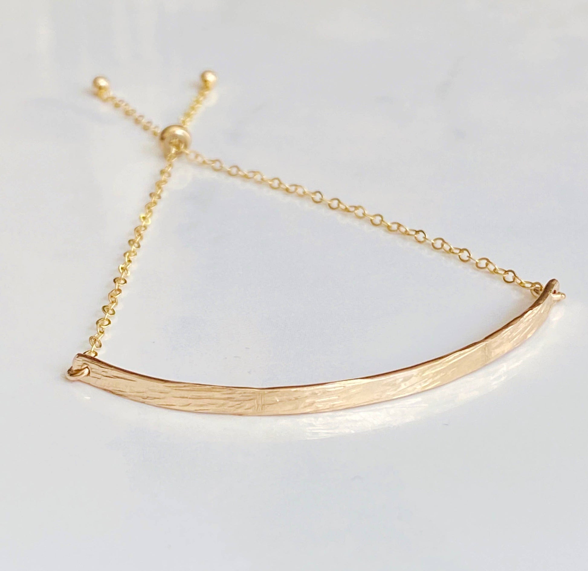 This cool modern bracelet would make the perfect gift for yourself or someone special in your life. It features a 14kt gold filled flat rectangle wire bar that is hammered with a scored texture to catch the light beautifully. The bar is 2 1/4” long. The chain is a sturdy but delicate 14kt gold filled cable chain. There is a sliding smart bead that slides up and down the chain to make the opening bigger or smaller to make it easy to put on and off. Simply slide the bead toward the bar for the desired fit. At the end of each chain is a 14kt gold filled bead accent.