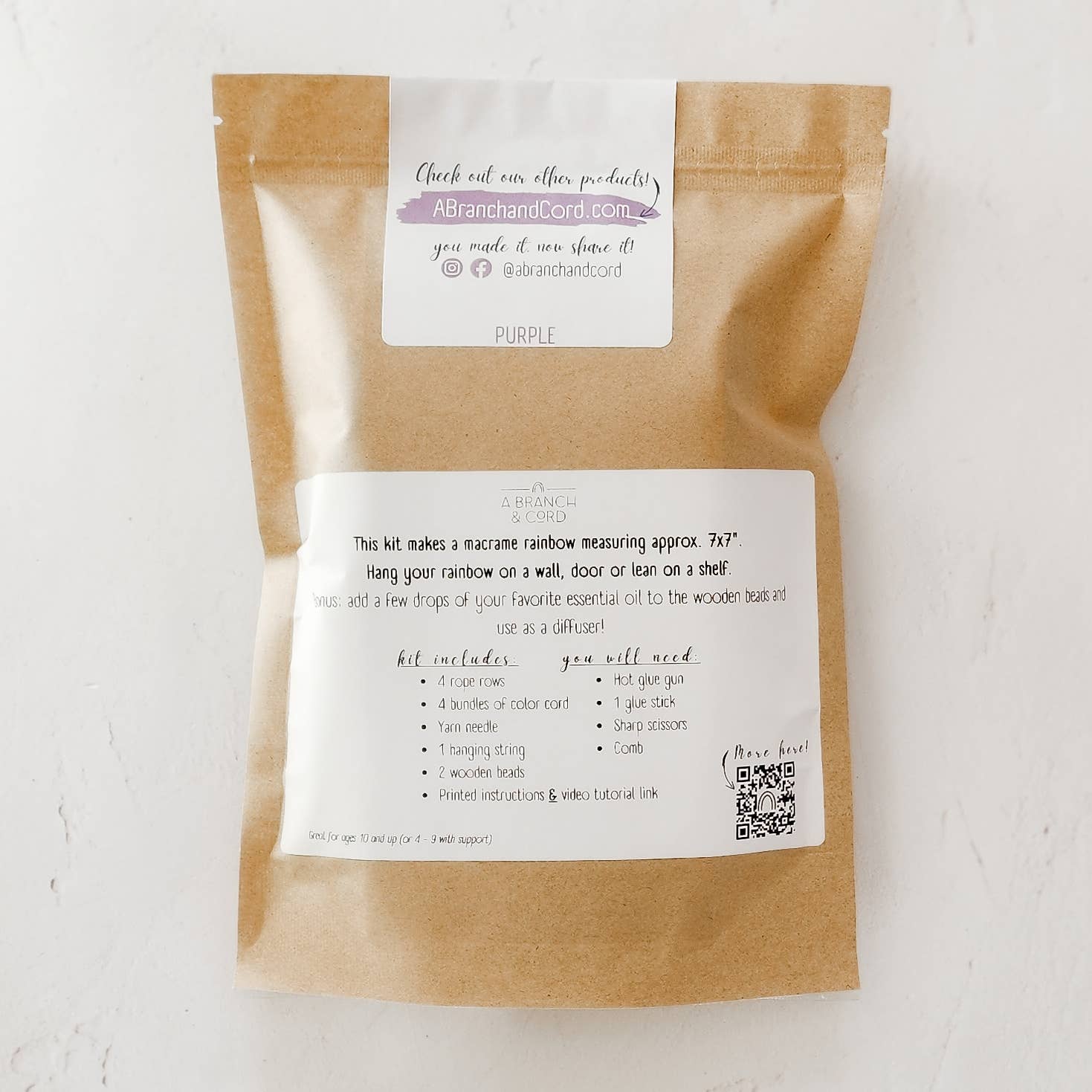 Our DIY Rainbow Kits offer a fun crafting experience that brings the joy of fiber art and vibrant colors together for both adults and children ages 10 and up or 4 - 9 with support. While the kit includes macrame cord, no macrame knotting is required in this kit! Simply the act of wrapping is needed to complete.