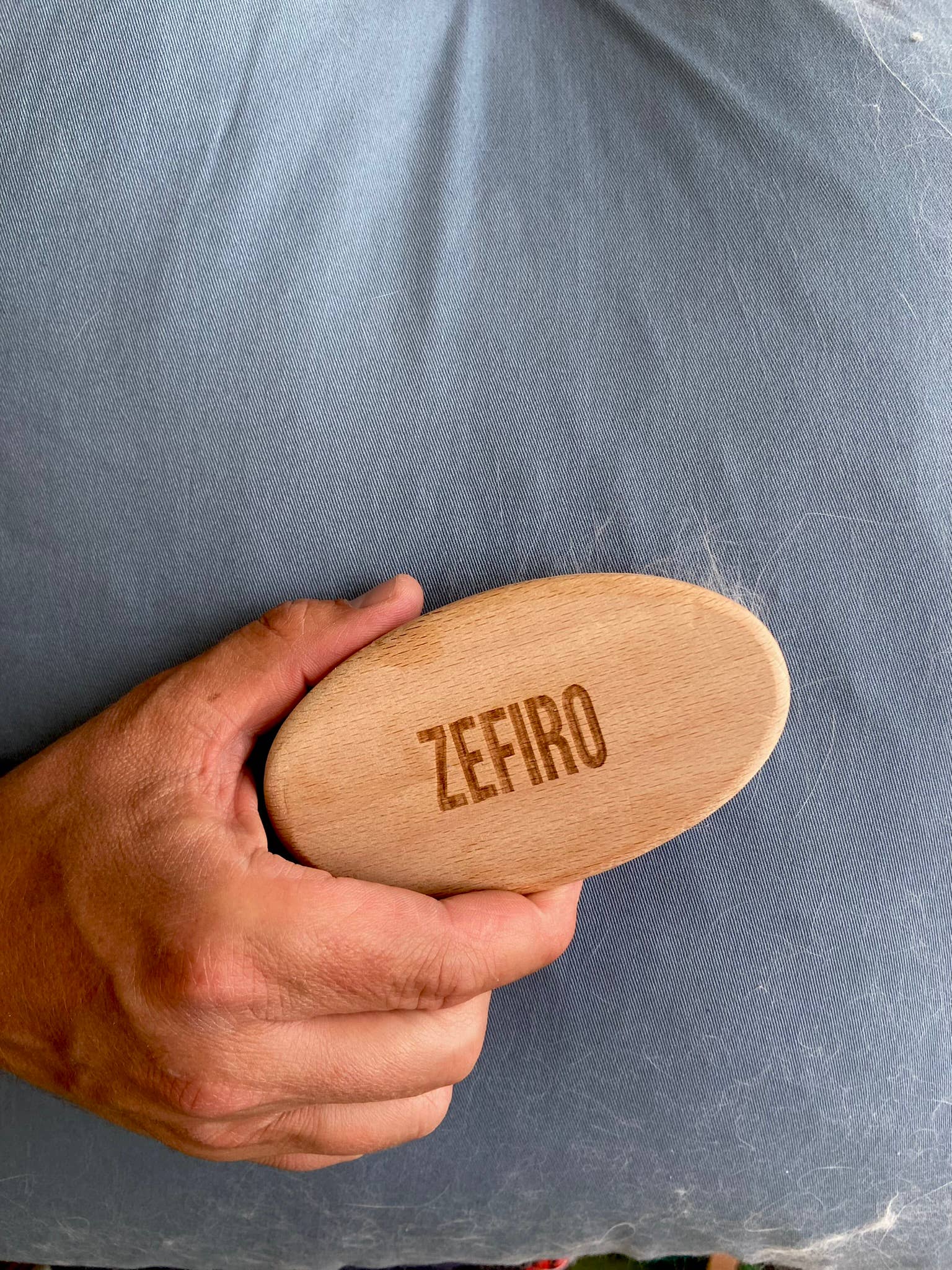 Our fuzz remover is made from beechwood, stainless steel and a polyester velvet.