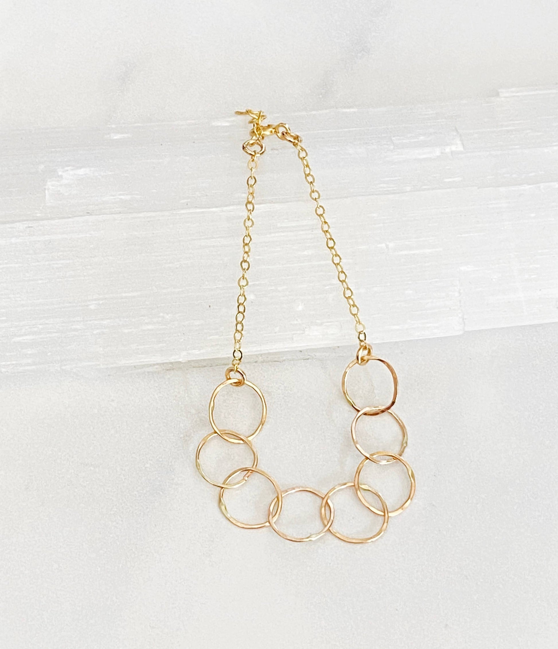 This pretty little bracelet makes a great layering piece or simply worn on its own. It’s features a row of 8 hand forged 14kt gold filled circles that are hammered with a dappled texture to catch the light. The fine cable chain is 14kt goldfill and is finished with a spring clasp and an extender. The bracelet can be worn from 6.75” to 7.75”