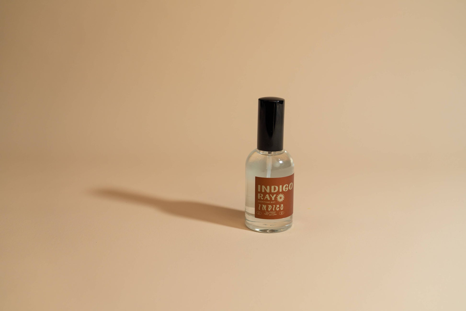Crafted with plant based & non-toxic isolates. 1.7oz glass bottle with a black metal fine mist sprayer.