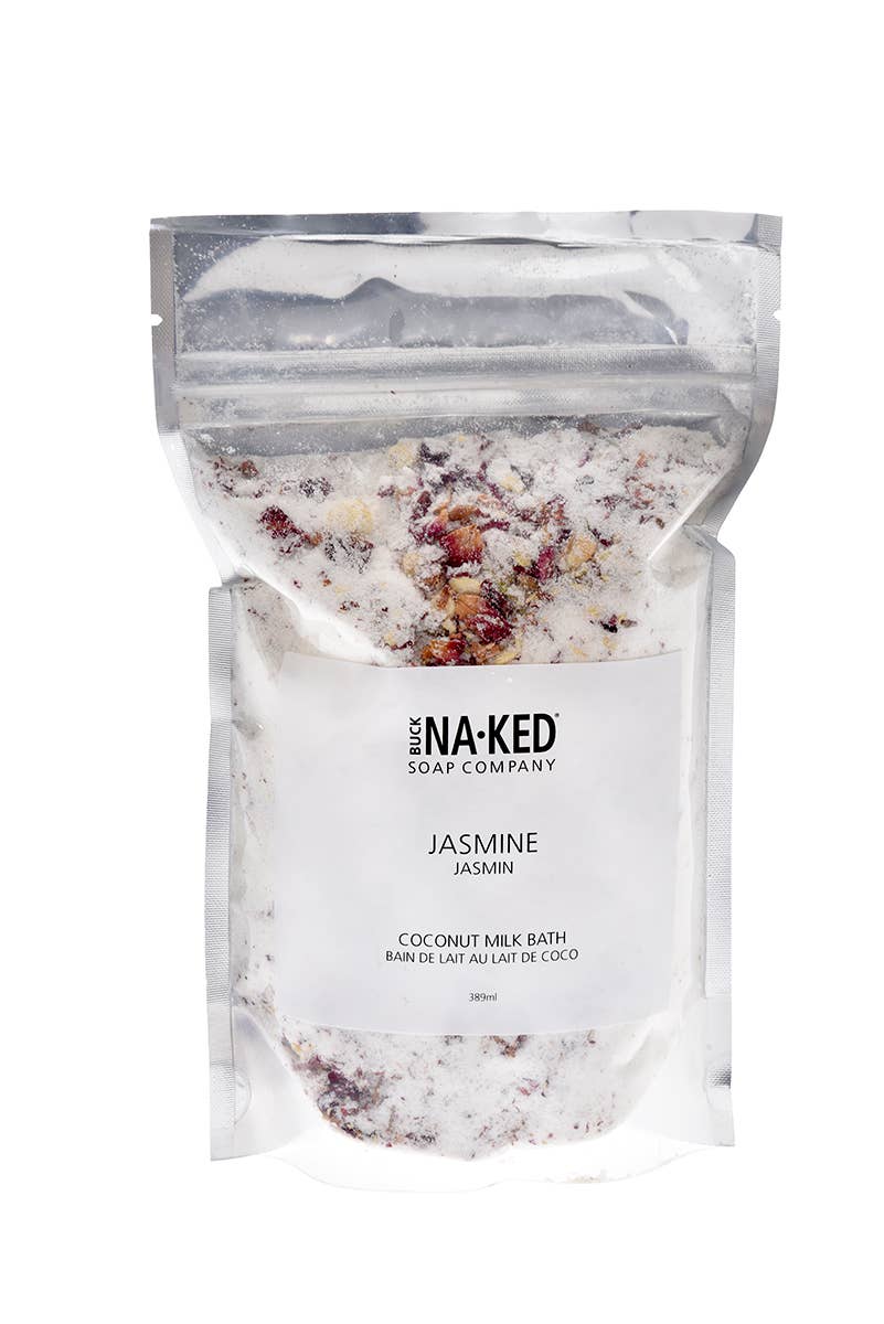 Take a dip into extravagant, skin enriching luxury with the Buck Naked Jasmine Coconut Milk Bath! This vegan coconut milk bath is rich in vitamin C, magnesium and copper, which help maintain skin elasticity and aid in the prevention of wrinkles. Combined with romantic jasmine essential oil and coupled with jasmine and rose petals, this coconut milk bath is lush and helps provide the perfect backdrop for a relating night in.