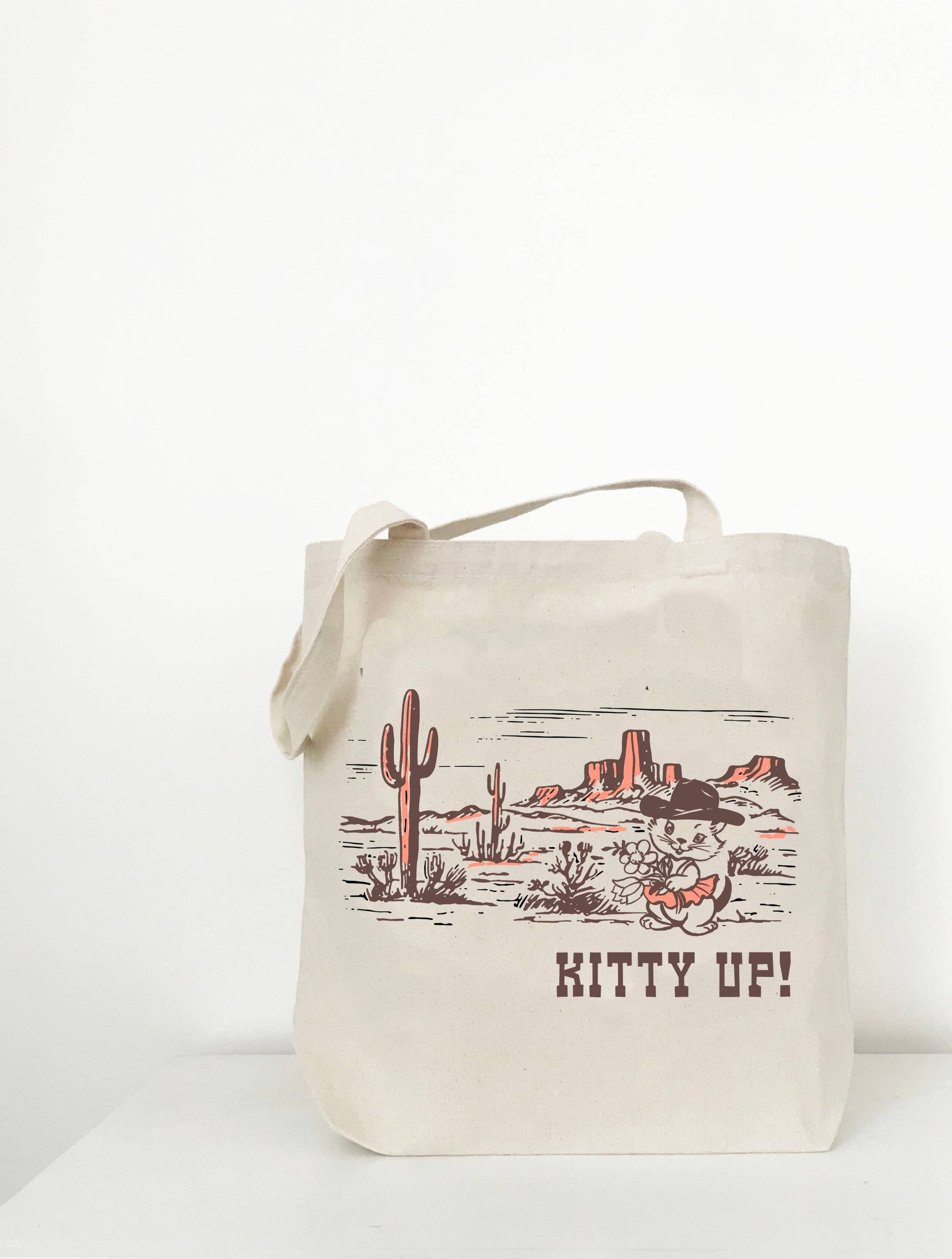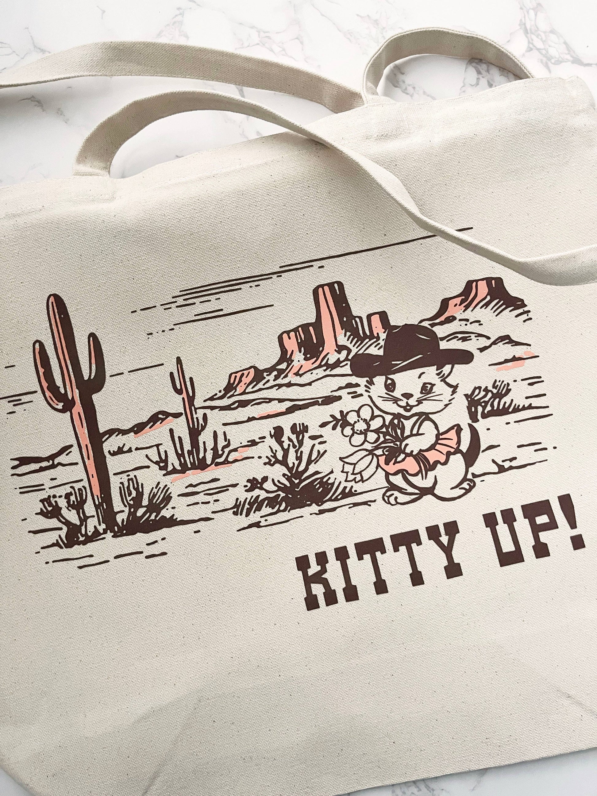 Kitty up cowgirls! Yee Haw! The cutest little cowgirl kitten ready to get rowdy. Live out your western dreams with our Kitty Up tote! Retro style cat in a cowboy hat with a desert scene hand printed on a cotton canvas tote bag. A must have for all your summer rodeo fun! Perfect for the farmer's market, library, beach, camping...anywhere you need to haul stuff and look good doing it!