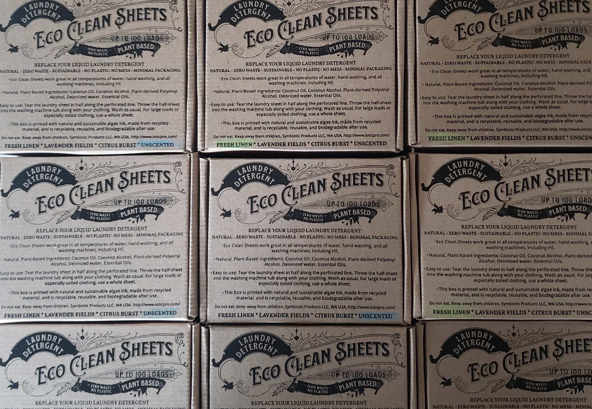 Eco Clean laundry sheets are minimally packaged in recycled cardboard boxes...NOW PRINTED WITH SUSTAINABLE ALGAE INK. No Petroleum-based inks! No Plastics!