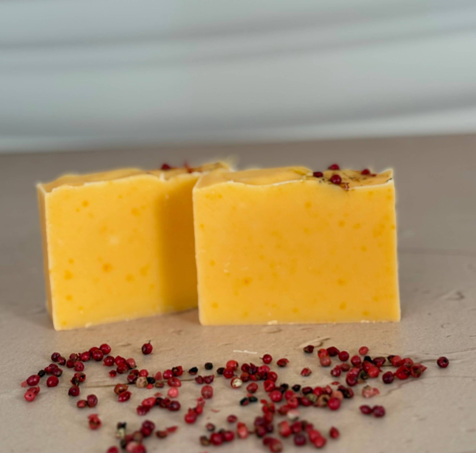 Bright, warm, and effortlessly serene, Mellow Yellow is like golden hour in soap form. Its golden hue reflects a vibrant blend of sweet orange, cooling eucalyptus, and grounding cedarwood, a scent that uplifts and soothes in equal measure. Crowned with bold red peppercorns and exotic saffron threads, this bar is both visually striking and aromatically unique. Let each creamy, skin-loving lather melt away tension and leave behind a soft, mellow glow.