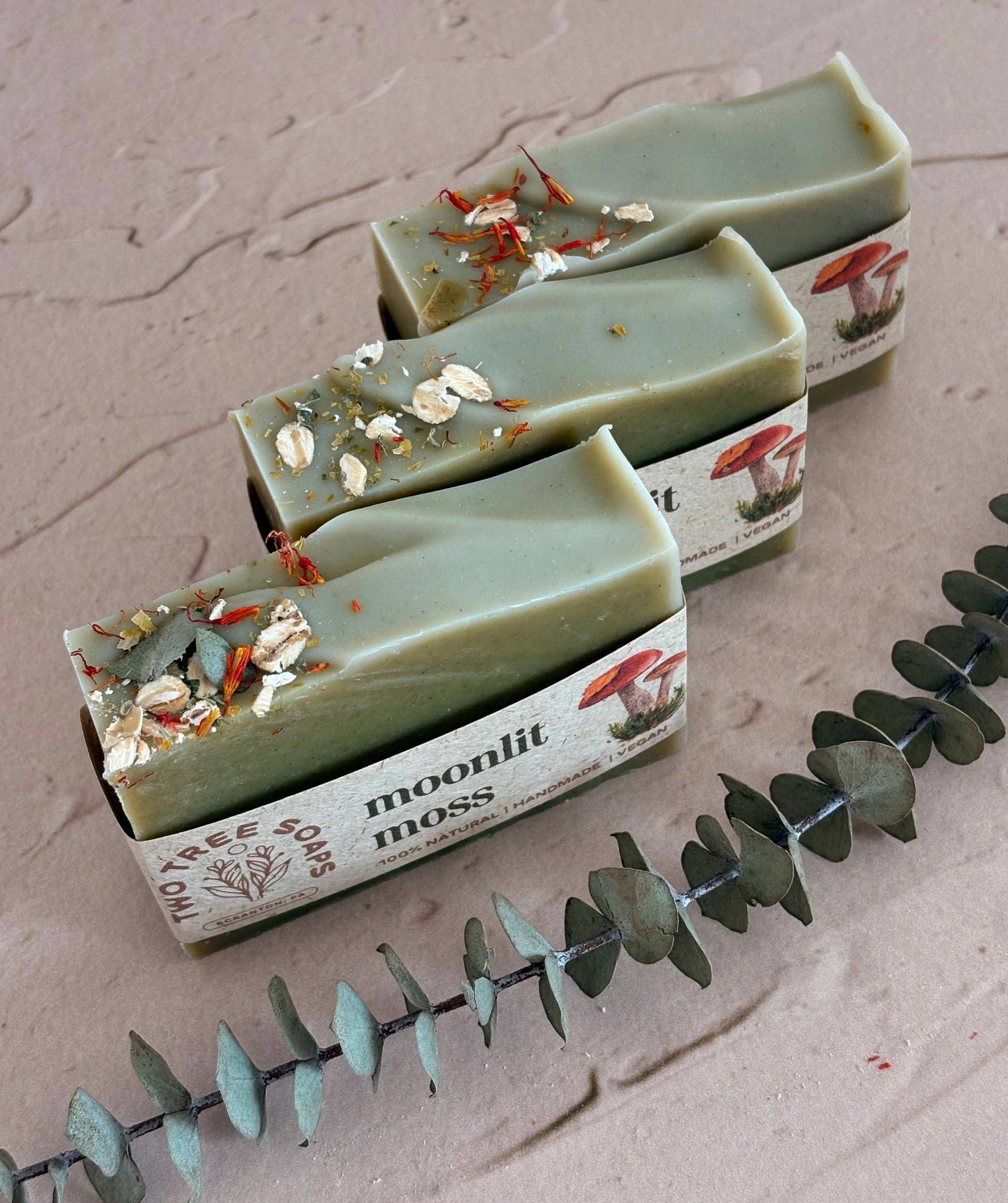 Mystical and fresh, Moonlit Moss transports you to a forest bathed in silver moonlight. Its mossy green hue reflects the soothing blend of lavender, patchouli, geranium, and spearmint—herbaceous, floral, and gently cooling on the skin. Finished with a verdant topping of eucalyptus, parsley, safflower petals, and nourishing oats, this bar is a dreamy escape into nature’s calm. Gentle, rejuvenating, and entirely plant-based, it’s a moonlit ritual for your senses and your skin.