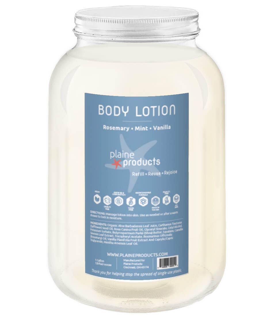 1.95 an ounce. Our body lotion’s vegan ingredients make this a lightweight, fast-absorbing formula and hydrating lotion. With aloe as the main ingredient, as opposed to water in most lotions, daily use will leave skin soft and supple. A little bit goes a long way. Safe for the whole family, it’s a choice that’s good for you and the planet. Our Products are: Free of sulfates, parabens, phthalates, silicone, and palm oil Vegan and have non-GMO ingredients Designed to biodegrade Baby safe and hypoallergenic Cruelty-Free, Leaping Bunny certified Free of single-use plastic One gallon of body lotion. Compatible with gallon jar refill pump. If you are repackaging for bulk dispensing we recommend glass containers.