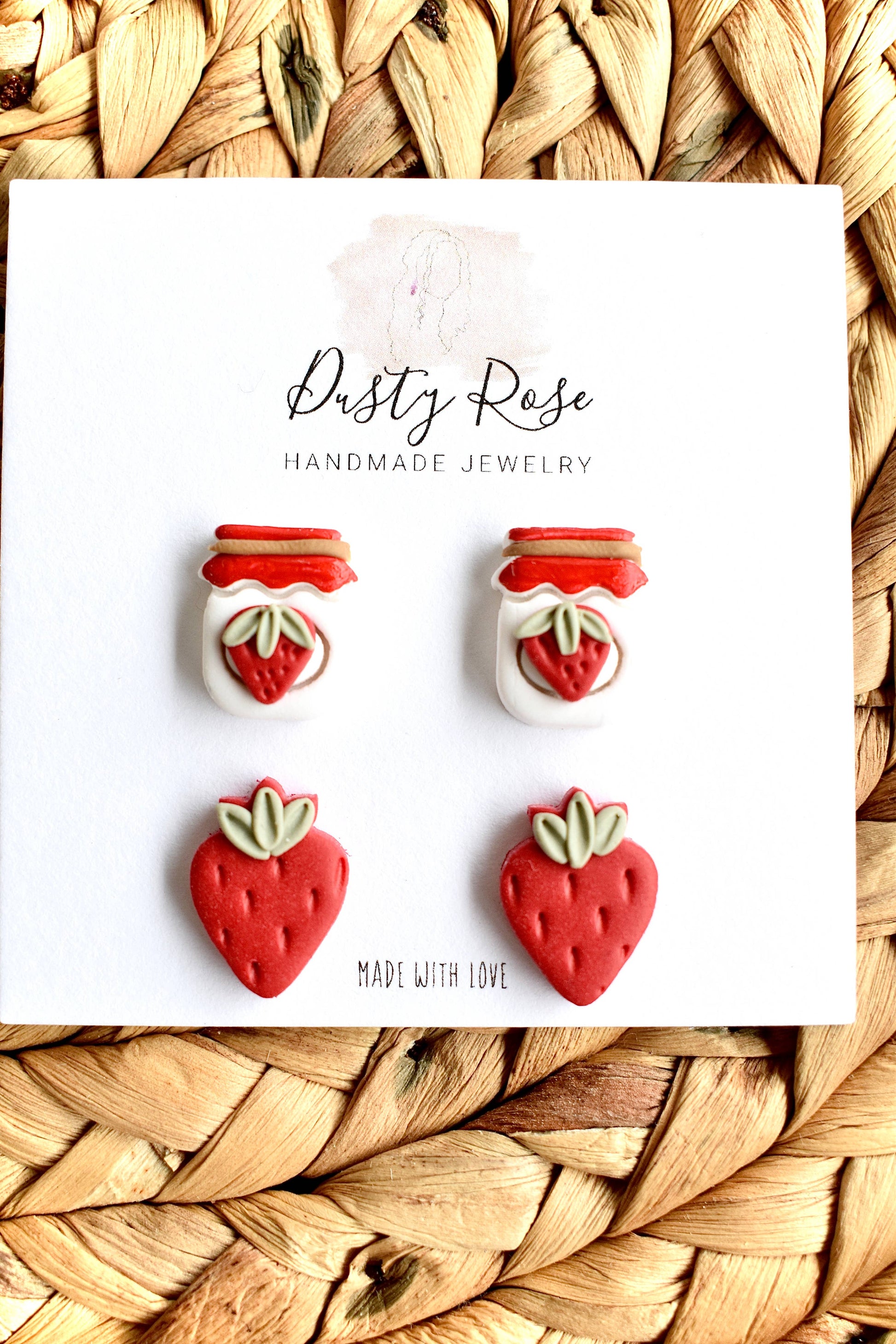 This stud pack comes with 2 pairs of earrings: a small strawberry and a white jam jar with a tiny strawberry on it.