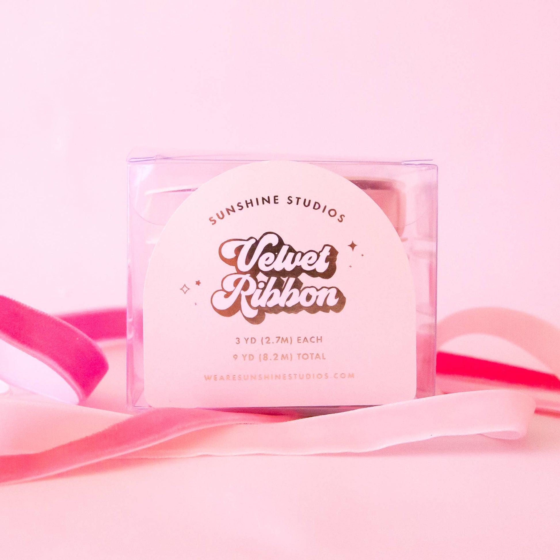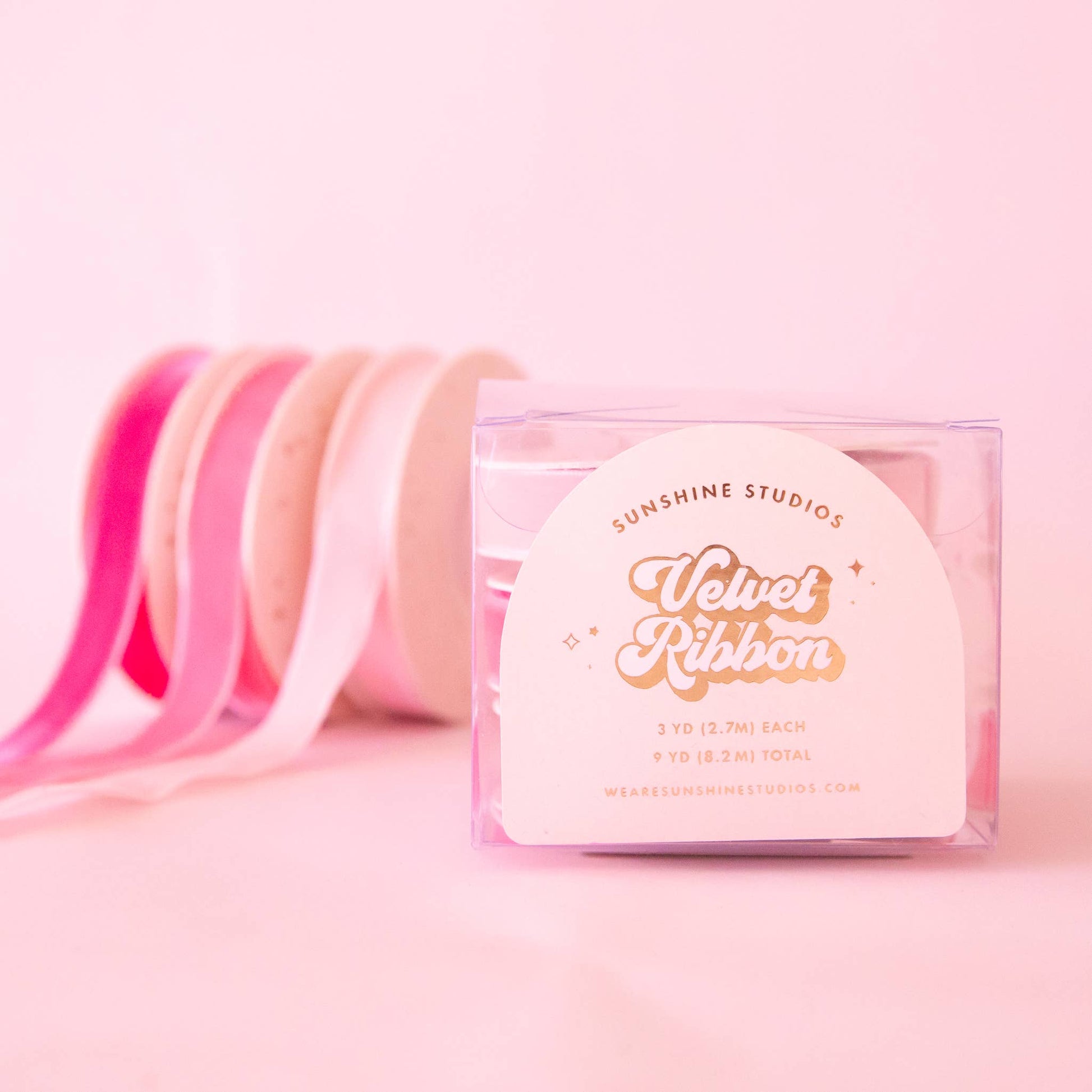 Step up your gift wrap game with our Velvet Ribbon Pack in the shade pink featuring three different colored spools of ribbon, perfect for adding a special touch to your present! .